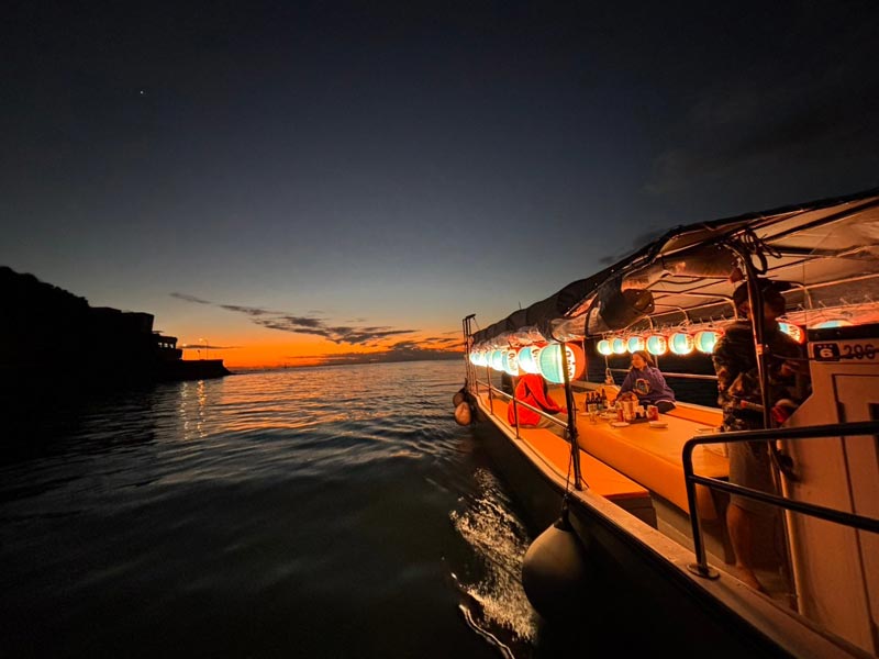 沖縄版の屋形船「イユミーバンタ号」は、沖縄本島中部、嘉手納町の嘉手納漁港を出航し、比謝川のマングローブ林を抜け、東シナ海でのサンセットクルーズへ。船上では水平線に沈む夕日を遮るものがないため、特に美しいサンセットを楽しめます。
